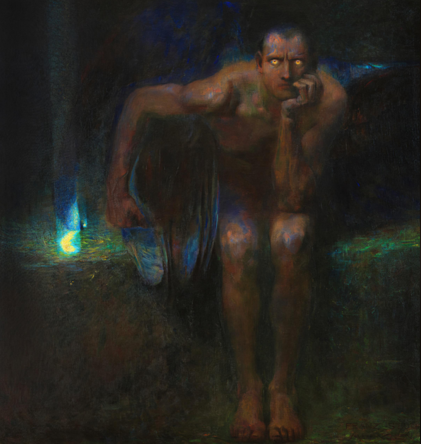 Как обычно, хочется начать с автора, а тут есть с чего начать, ибо речь пойдет о бунтаре! Франц фон Штук - сын деревенского мельника, учился в Королевской школе искусств и ремёсел в Мюнхене, а затем в Мюнхенской академии художеств (эта строчка взята из вики, но тем не менее, как можно догадаться деревенские мельники середины 19го века в Германии жили весьма кучеряво). И вот обучившись у почтенных дедов классиков понесло Франца совсем в другие степи. Подавай ему символизм да еще и эротизм, и чтоб не мелко за листочком, а ярко, крупно, масштабно! Викторианская публика взирала на такое творчество с присущей ей любопытствующей к эротизму христианской добродетелью и вскоре хер Франц не просто основал целую школу с последователями а даже удостоился дворянского титула и всеобщего признания. Вот что значит уметь рисовать красивые перси. Кстати, в этой самой школе, именуемой Мюнхенский сцессион обучались и Кандинский и какие-то еще нонеймы. Но вернемся к картине, а именно к символизму. Как вы понимаете в жанре символизма писать полотна очень мудро и практично, ибо это всегда вызов амбициозному созерцателю. А что символ? А символ чего? А этот мазок тоже символ, или автора тошнило селедкой? Благодатнейшая почва для размышлений, стоя напротив очередного такого полотна! И после краткого пояснения отношения вашего почтенного критика к символизму, еще раз вернемся к картине, название коей "Люцифер" (полтора на полтора метра на минуточку) Первое, что видит тут, как мне кажется любой имеющий очи, описывается примерно так "сидит какой-то мужик с желтыми глазами". Дальше по законам любого изображения взгляд приковывают светлые (максимально светлые) области и тут загадка.. Что это за зеленожелтая хня (в банке)? Или это столб? Или фонарь? Но где же свет от него, точнее где же тень.. но да ладно. Продолжаем рассматривать голого мужика (что-то еще такое странное у него в руках), вспоминаем что название "Люцифер", смотрим на мужика, на название, потом снова на мужика.. и тут вспоминаем что это ж символизм епта! Теперь все понятно. Дьявол (он же люцифер) вообще не должен выглядеть как что-то злое красное с копытами и рогами, дьявол среди нас, в каждом из нас (ну по крайней мере в каждом мужчине) он вполне человечен. И это первая (достаточно очевидная) интерпретация символизма. Дальше детали. Их тут немного, намеренно темный фон, как бы кричит, поооофиг что там на фоне - в глаза ему смотри! Глаза конечно нечеловеческие (как впрочем и крылья за спиной) но что в них? Как будто они должны немного гипнотизировать (причем видно что Люци явно в раздумьях/в бане/в подземелье/в себе и ему явно не до созерцателя, но раз уж смОтрите - УЗРИТЕ. Но гипноз срывается, потому что загадка желтого крюка все еще остается неразгаданной (не говоря уже о том символчегоонздесьааа!). Ну что, ж копнем в название. Как ни странно со словом Люцифер, когда-то произошла изрядная путаница, и все по вине аллегорического трактования стиха некоего пророка Исаи, который сравнил вавилонского царя и с сатаной и с утренней звездой (которую в свою очередь древние римляне называли Люцифером) и потом все запуталось, но Люци и Сатана с тех пор рука об руку и будто даже одно и то же. Но на Сатану как будто "мужик в бане" не тянет, а вот на Люцифера вполне. Резюмируя. Люцифер не самая известная картина старины Франца и надо сказать 