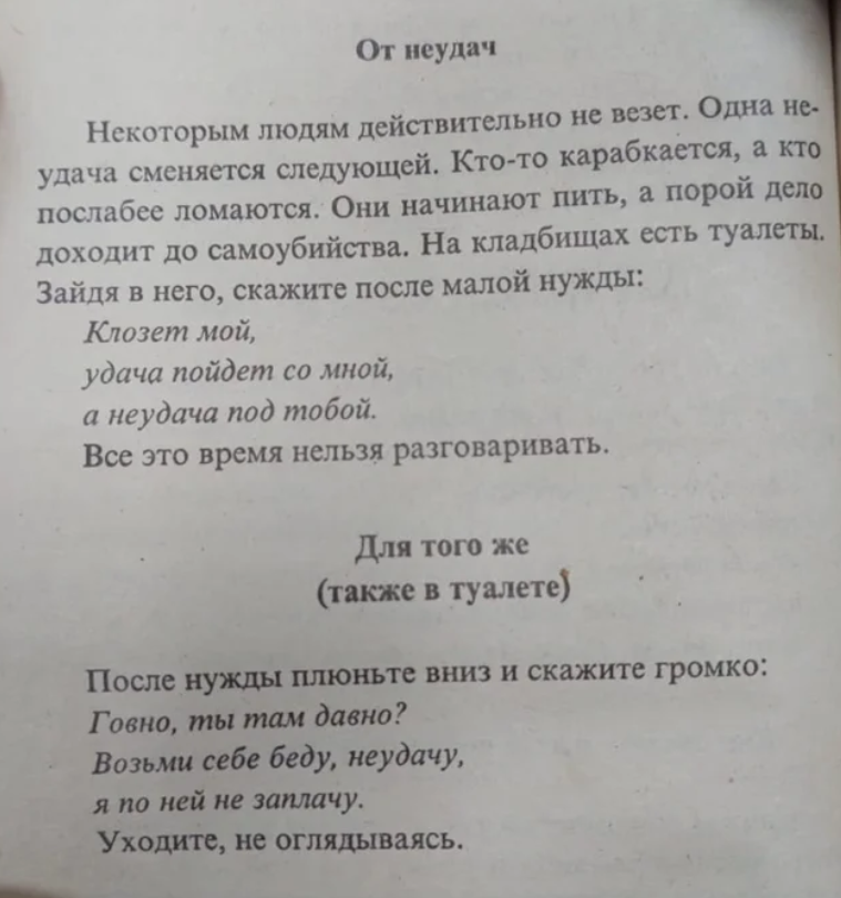 | Цитата ТараФонКляйн (  ) знает что то такое Защитный заговор для осквернённого кладбищенского говна "Я тут счастливое лежу, столетьями на жопы гляжу. Черви меня жуют, мухи обсасывают. Летите же мухи мои ненаглядные и возьмите с собой несчастья и беды, на меня дурной головой насланные и положите осквернителю в пищу его и пусть вкушает их снова и снова."